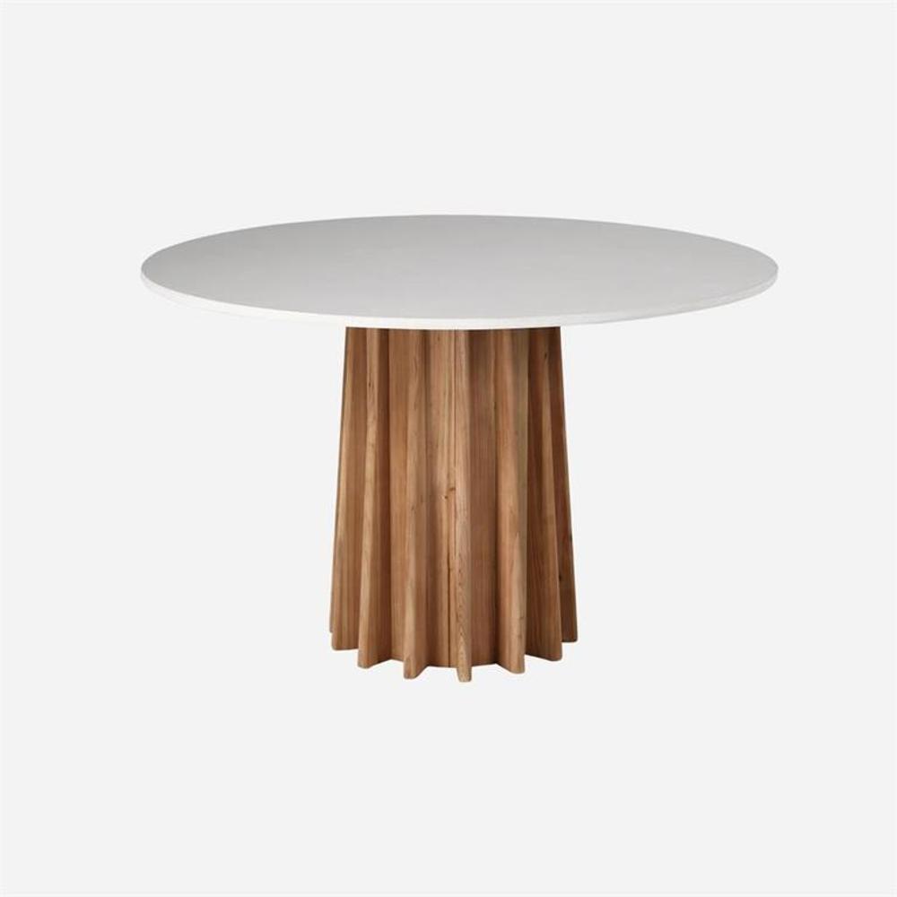 The Wyllow Table combines a smooth white stone tabletop with a warm natural wood base for an elegant organic contrast. Its rounded design and minimalist silhouette create a versatile centerpiece for modern or Scandinavian-inspired spaces.