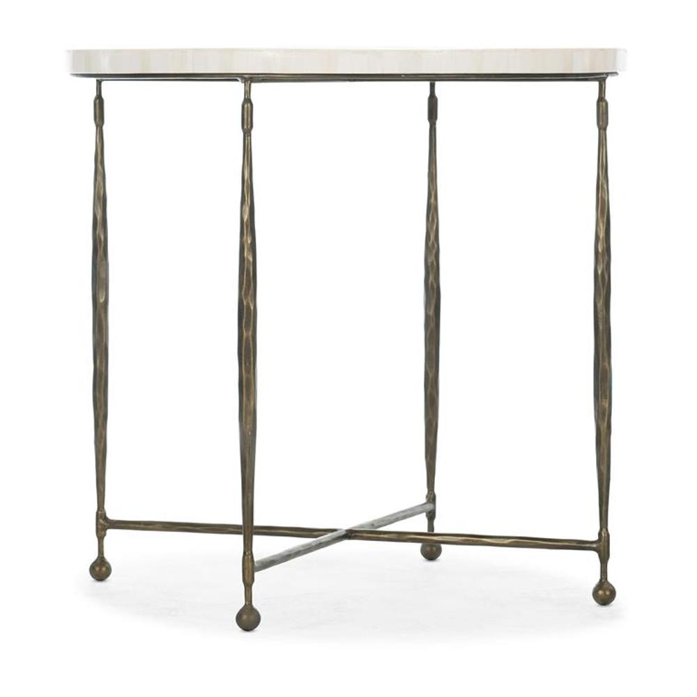 Eclectic accent table featuring natural bone inlay top and bronze finished iron base.