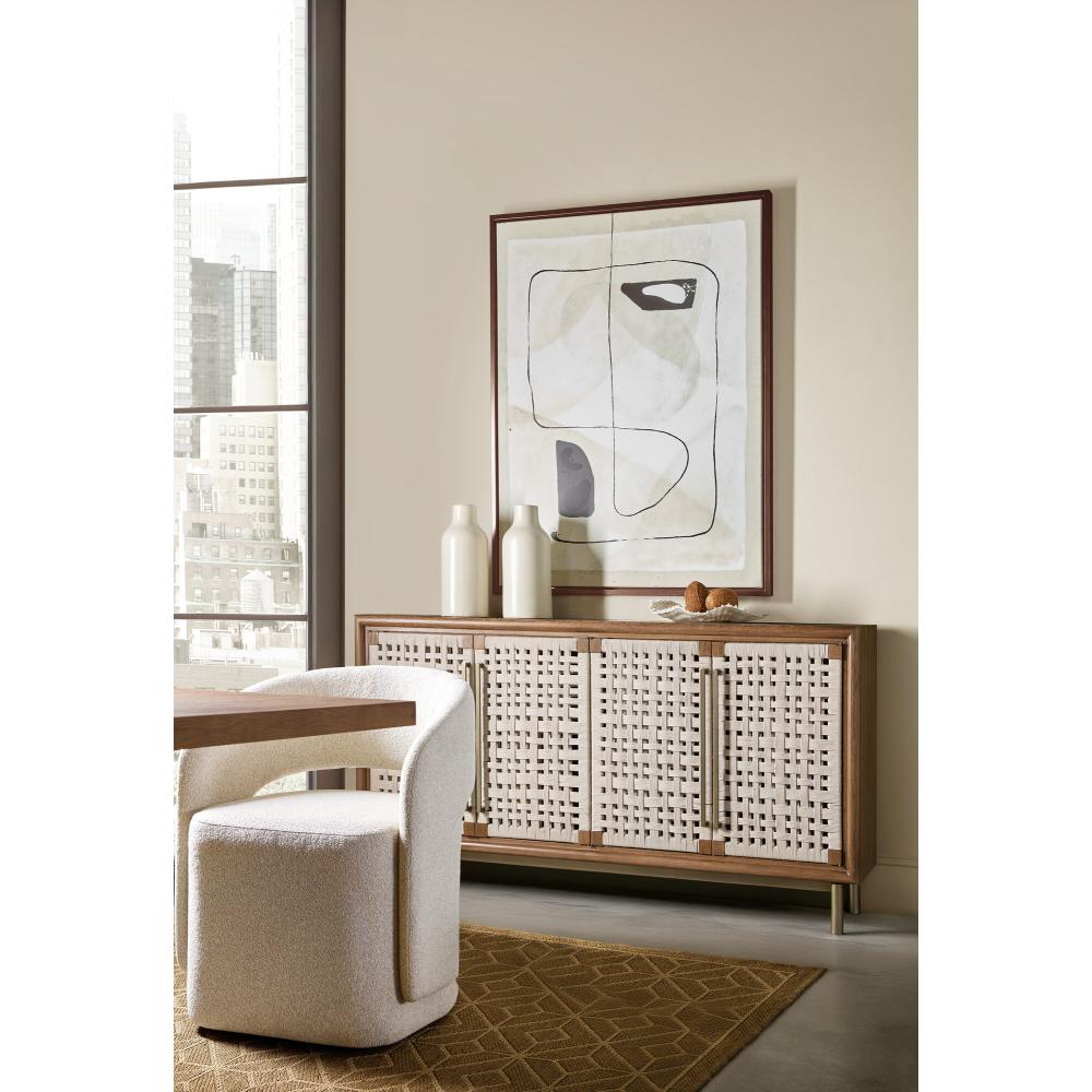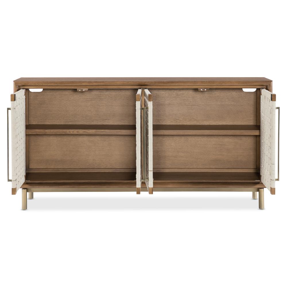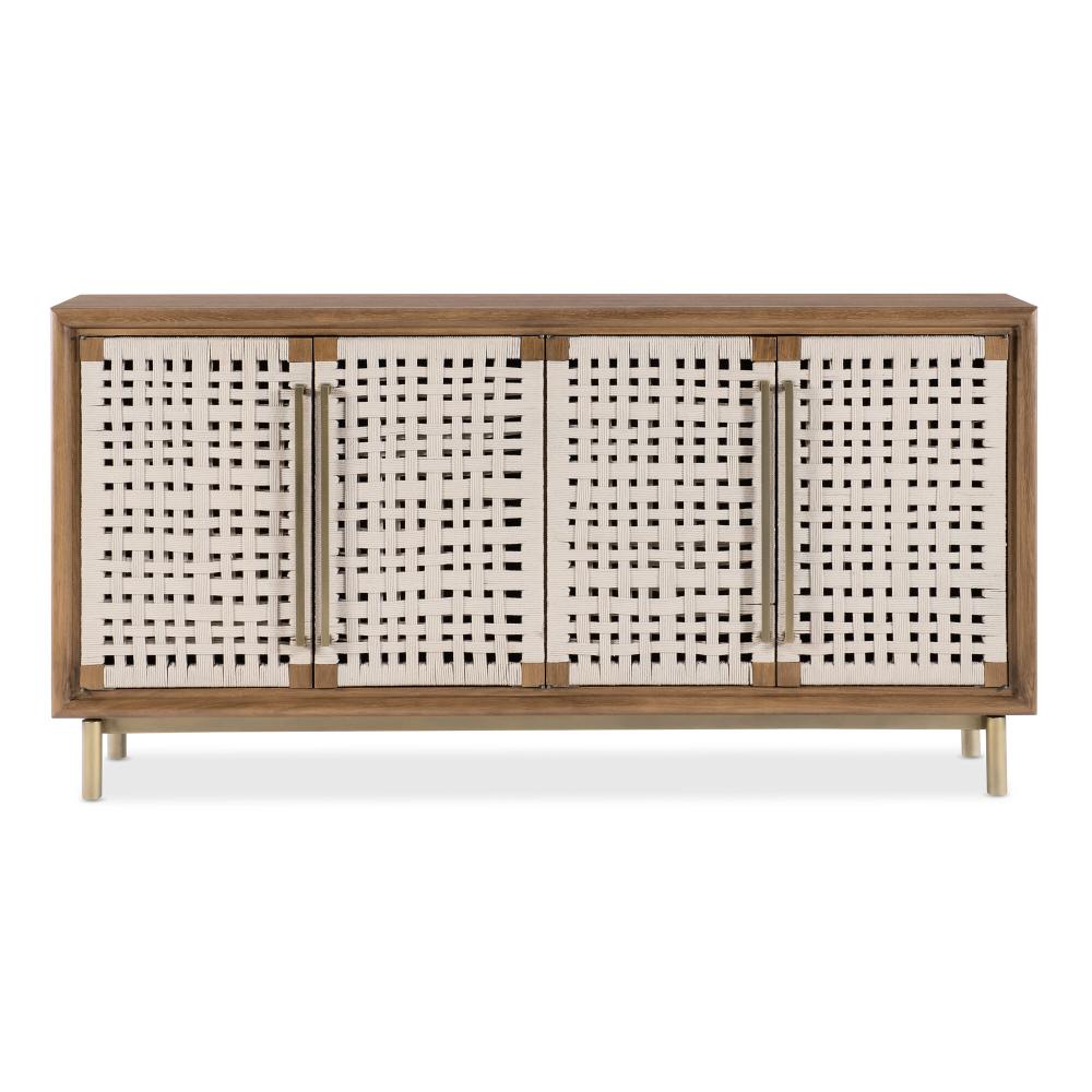 Beige rope door fronts offer texture and warmth on this four-door credenza with open weave panels, oak solids, and champagne-tone hardware.